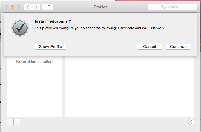 Click Continue in when asked “Are you sure you want to install profile "eduroam" ”?. (See Figure 3)